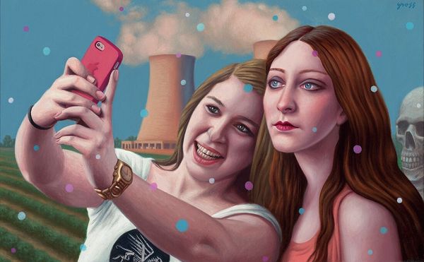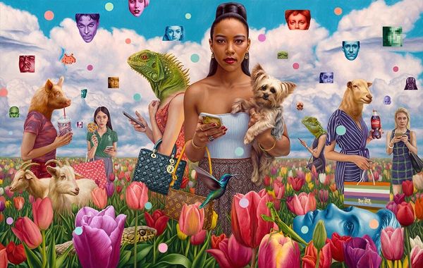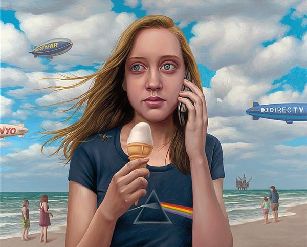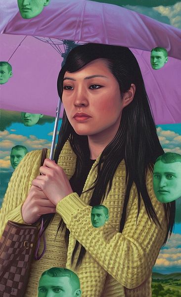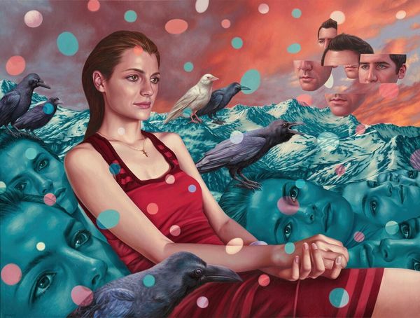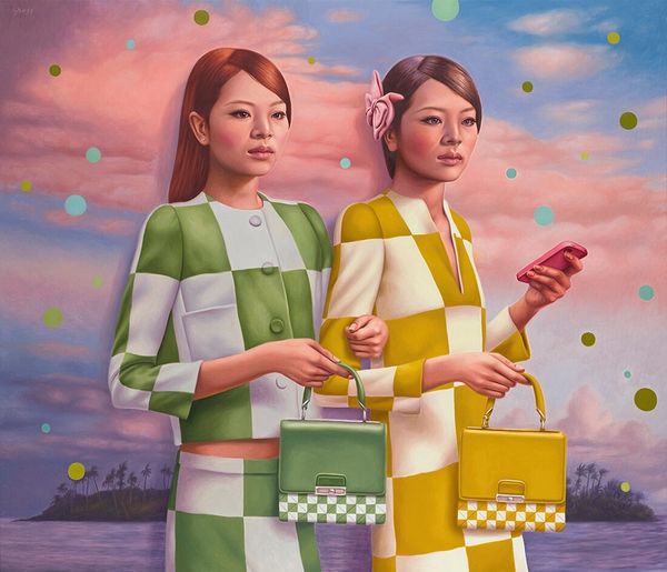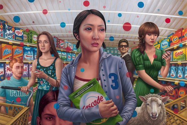 Curator: Whoa, that's intense. It feels like a beautifully painted anxiety dream. What is this thing? Editor: This captivating piece is by Alex Gross and is titled "Twins". It appears to be a mixed media work including acrylic, characteristic of his pop surrealist style. Curator: Pop surrealist, got it. Those two women, or should I say "twins," riding that lemon-yellow scooter through that insane crowd… they seem so detached. Almost… numb? Like they are just cruising through the chaos. It is both amusing and disturbing to see corporate and cultural images floating through the composition Editor: The density of detail really captures the hyper-stimulation of modern urban life, doesn't it? The ghostly faces hovering around… like a commentary on the constant surveillance we’re subjected to, and even participate in willingly. The zebra crossing, that floating buddha—every element feels like a deliberate choice reflecting how we deal with a world where high and low culture meet.. Curator: Totally! Like advertising, tradition, digital identity all mashed into this weird soup. Even the muted colors of the people versus the bright hues on those surreal figures create an unsettling visual rhythm. Do you think he is suggesting how desensitized we are to everything, and what is actually more present, vivid, immediate is something that doesn’t really “exist"? Editor: That is definitely a read one could take from it. And think about where paintings like this fit within contemporary art spaces and debates; Does the piece succeed because it so expertly mixes figuration, a traditionally celebrated part of Western painting, with commentary about contemporary mass culture? Or does this actually come off as more academic in light of more provocative installation art being made right now? Curator: Good point! I can definitely appreciate both things. But this thing is going to haunt my thoughts for a while. It is unsettling, memorable, and brilliantly bizarre. I guess the effect is a painting that asks about our society by portraying society, like, to the max. Editor: Precisely! It’s a fantastic illustration of how artists grapple with depicting an era that feels both utterly familiar and utterly alien. A visual metaphor for the paradoxes we inhabit.