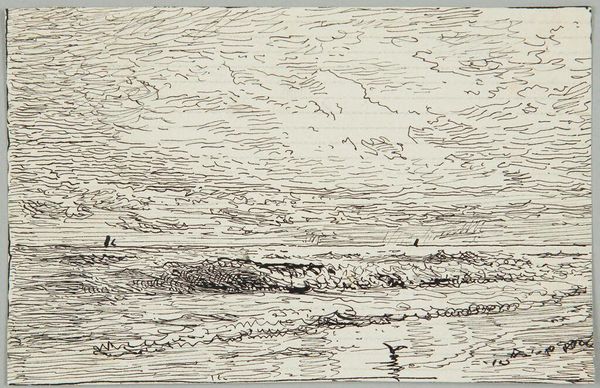Editor: This drawing, attributed to the style of Turner, captures a beach scene. It feels quite somber, almost bleak. What symbols do you see at play here? Curator: The beach, a liminal space, often symbolizes transition and the subconscious. The figures, rendered indistinct, perhaps represent humanity's fleeting presence against the vastness of nature. Consider Turner's fascination with light—does the muted palette evoke specific emotions or cultural memories for you? Editor: It definitely creates a sense of melancholy, a reflection on time. Curator: Precisely. It invites us to contemplate our place within the larger cosmic narrative. This feels like a meditation. Editor: I see the artist trying to capture fleeting moments. It's fascinating how the artist uses symbols to convey so much emotion. Curator: Indeed. The symbolic weight carried within even seemingly simple sketches can resonate deeply.