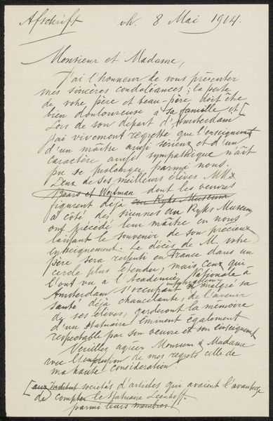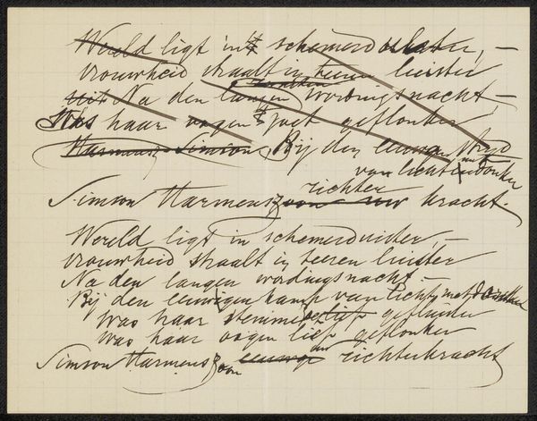 Editor: This is "Conceptbrief aan anoniem" by August Allebé, dating roughly from 1848 to 1927. It seems to be ink on paper, a handwritten letter perhaps? There's something very intimate about seeing someone's handwriting like this. What draws your eye when you look at this piece? Curator: Well, consider calligraphy's long history of symbolizing status, education, and inner virtue. Look at how the script itself performs the message. Do you see how the slant, pressure, and flourishes all communicate something beyond just the words themselves? Editor: I guess so. It does feel… deliberate. Like the writer is very aware of how the words look, not just what they mean. Curator: Precisely. The visual form enhances the message. Think of it as a dance between language and image. The consistent slant might suggest a kind of forward momentum or purposefulness. What feelings do those looping ascenders evoke in you? Editor: Hmm, maybe a sense of elegance or formality? But it’s also a little difficult to read. Was that intentional, perhaps? Curator: That's perceptive. Think about how secrecy, discretion, or even a hint of mystique can add another layer to communication. This tension between legibility and opaqueness adds complexity. The act of deciphering becomes part of the meaning. Do you think the paper material adds another dimension to its artistic qualities? Editor: Now that you mention it, yes! It has survived for quite some time, adding authenticity and giving a tactile appeal that printing wouldn't. Curator: And it speaks to cultural memory; how the message survives, evolves, and potentially transforms over time. Editor: This makes me appreciate how handwriting embodies not just words, but cultural values too!