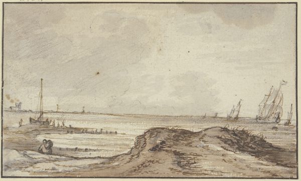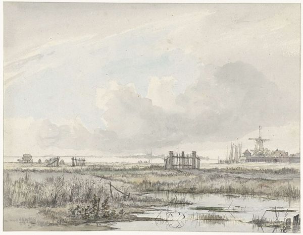 Editor: This is Muirhead Bone’s "Golf at Canter, Sussex", rendered in watercolor. It evokes such a melancholic mood, with those stormy skies and muted colors. What social commentary do you see embedded in this artwork? Curator: What strikes me immediately is how the leisure activity of golf becomes intertwined with the Sussex landscape. Can we interpret it as a commentary on class and access to nature, perhaps even a critique of how land is used? Do you think the weather serves as a metaphor? Editor: The oppressive weather might hint at a social unease. I wonder, what about the choice of medium – watercolor? Does it contribute to this atmosphere of… restraint? Curator: Absolutely. Watercolor, with its delicate and sometimes unpredictable nature, contrasts sharply with the privileged activity depicted. Consider how the ephemeral quality of watercolor could mirror the transient nature of social hierarchies. Does the lack of vibrant colour play a role in your reading of social unease? Editor: That’s fascinating. It makes me reconsider how art can subtly critique even seemingly benign pastimes. It certainly isn't as simple as pretty landscape. Curator: Exactly. It’s about pushing past the aesthetic surface and interrogating the underlying power structures. We are forced to question the narratives embedded in representations of leisure and landscape. Editor: I hadn't considered that Muirhead Bone could be embedding a subversive dialogue about society and the environment into something as simple as golf. It goes beyond surface aesthetics, prompting a deeper look at culture. Curator: Precisely, the social is embedded within our perception of landscape. Let's keep questioning those unspoken narratives within art!