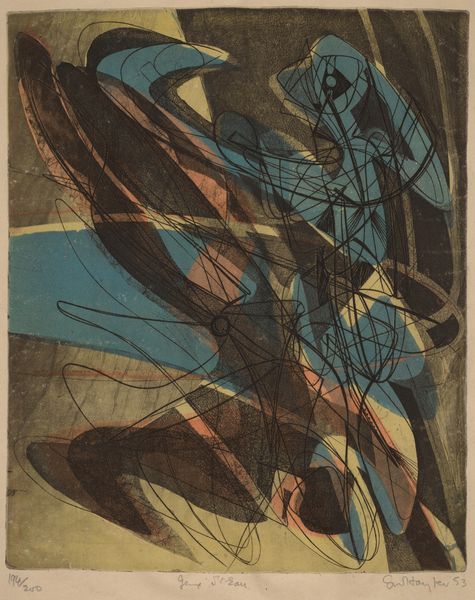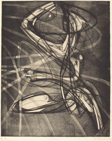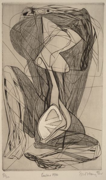 Curator: Alright, let's turn our attention to this striking print: Stanley William Hayter's "Angels Wrestling" from 1950. It’s an etching, full of furious energy. What springs to mind for you when you first look at this, Editor? Editor: Immediately, I see turmoil. The chaotic lines, like frantic energy released from tightly wound springs, suggest inner conflict made visible. There's an almost brutal, raw honesty here. Curator: I think you've nailed it. Hayter was fascinated by the subconscious, exploring those hidden dramas through automatic drawing, a sort of visual free-association. Think about the angel motif itself, a classic symbol for spiritual striving. To show them wrestling—that implies this struggle is inherent, even in the most divine aspects of ourselves. Editor: It’s so interesting you mention ‘divine’—to me, this depiction shatters that very concept! Look how Hayter destabilizes their forms, fragmenting them into abstract shapes. Aren't angels supposed to be graceful beings? This feels like an interrogation of the entire angelic image, as if it's caught in a whirlwind. Curator: I suppose, the interesting thing about Hayter is how unafraid he was of taking a classical image and giving a modern twist. Note that he uses etching, an Old Master's technique, and then radically uses a range of motions to bite the plate. Almost like the technique itself mirrors this fraught push-and-pull, which could definitely add meaning. Editor: Yes, exactly! And observe the strategic use of light and shadow. The grayscale amplifies the gravity of the scene and contributes to the sense of weighty symbolism. It’s not merely about angelic combat, but of cosmic import, reflecting our internal tug-of-war between order and chaos, the spiritual and the material. Curator: Absolutely. So, by bringing abstraction, symbolism, and an interest in automatism together, it asks you to think about what angels are really doing, not in some ethereal heaven, but within all of us, fighting it out for resolution. Editor: To see it laid bare like that is really powerful. Hayter allows the struggle—and the beauty—to be shown with an unmatched clarity.