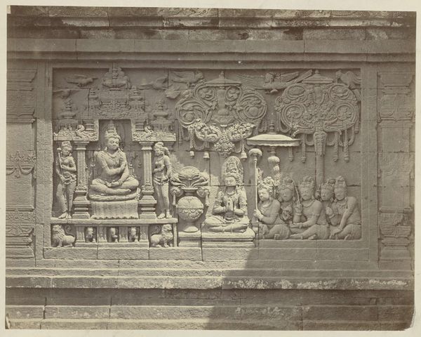 Curator: Looking at this collotype print, I find myself drawn to the photograph itself, aside from the carved niche it depicts. Editor: Absolutely. It feels almost haunting. There's a weight of time visible in the texture of the print, and a profound sense of stillness emanating from the image of the temple carving. Curator: This piece captures details of the decorated niche of Candi Puntadewa, likely on the north side of the structure. The photographer, Isidore Kinsbergen, framed this image of the Dieng Plateau, in Central Java province. These photographic surveys took place likely in the 1860s. Editor: Notice the fierce face carved above the niche’s doorway? This symbol, found frequently in Southeast Asian temples, protects the sacred space. Below, scrolling tendrils of leaves create patterns and further enhance the sense of nature’s powerful and enveloping presence, not to mention, a reminder of the incredible handwork from the builders. Curator: The colonial context is difficult to ignore here. Kinsbergen, a Dutch photographer, was meticulously documenting these ancient sites. Editor: What about the symbolism resonates for you from this image? Curator: Seeing it archived and treated as scientific record rather than as a place of worship. The history of documentation and collecting in this era feels problematic in hindsight. The archive and museum become tools to demonstrate the "riches" seized during colonial occupations. Editor: Yet, there’s undeniable artistry here, both by the Javanese sculptors and by Kinsbergen himself. I mean, just look at the play of light on the stone—the textures he's able to capture in this collotype print. Curator: Yes, the photograph certainly bears a haunting beauty; however, these images often mask or perhaps overwrite local histories, essentially reducing cultural sites into objects for scientific observation, fitting them into a western way of understanding art and history. Editor: You are correct, these nuances in the historical context, alongside the artistry, deepen our understanding of this powerful image, giving way to broader understandings of cultural legacy and perhaps what images might stand for in the future.