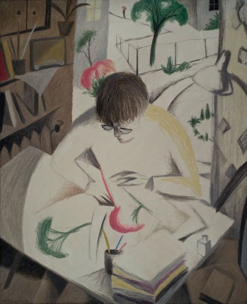 Franz Marc made this painting, The Dream, with oil paint, but we don’t know when. See how the composition is arranged into these blocky shapes, almost like a stained-glass window? I think this gives a feeling of something very carefully pieced together, but in a childlike way. Take a look at the blues, pinks, and yellows, and the way Marc lets the paint sit on the surface. It isn’t trying to trick you into seeing real space. It is not window-like. Instead, it is about the feeling of the paint and the ways it becomes alive. Notice the texture of the lion in the bottom left, and the way it almost blends into the yellow of the house. I love how this area becomes a kind of microcosm for the whole painting, blending and blurring of forms, and a reminder of how seeing is really about feeling. Marc reminds me of Marsden Hartley, who also liked to work with big color and very intense subjects. Marc’s paintings can be taken so many ways, and that’s what makes them so great to look at.
