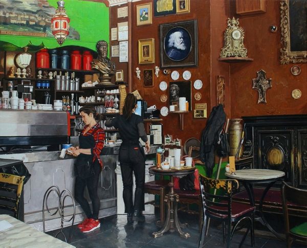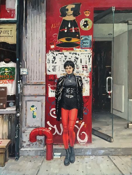 Vincent Giarrano's "China Wok" presents a slice of urban life through the formal elements of color, texture, and composition. The eye is immediately drawn to the stark contrast between the dark, almost monochromatic façade of the building and the vibrant yellow awning. The artist's thick brushstrokes add texture to the building’s surface, creating a gritty, palpable sense of decay. Giarrano disrupts traditional notions of beauty by focusing on the mundane and the overlooked, which is seen in the trash bags and the parked bicycle. "China Wok" prompts a discussion about representation and reality. The painting is not simply a depiction of a restaurant; it reflects broader concerns about urban space, transience, and the aesthetic value found in everyday life. Giarrano uses the formal qualities of his medium to engage with a cultural discourse, inviting us to reconsider our perceptions of the urban environment.