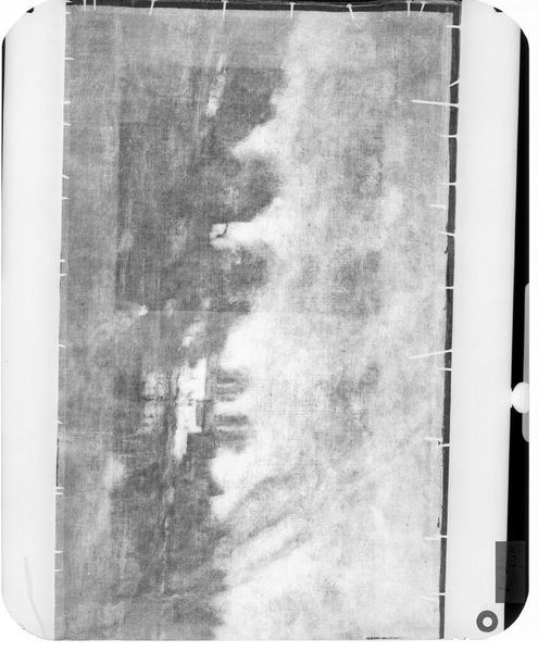 Editor: This is an X-radiograph of "Portrait of a Lady" potentially by Sir Joshua Reynolds. It's fascinating to see beneath the surface, almost like an archaeological dig. What does an image like this tell us about the history of the artwork and its creation? Curator: This radiographic view unveils the painting's material existence and process. It reveals the physical supports, pentimenti, and areas of damage and repair. Think of the layers of social and economic context embedded in each artist's decision and the museum's ongoing preservation. Editor: So it shows both the artist's hand and the institution's? Curator: Precisely. The X-radiograph speaks to the public role of art, it is an image that highlights both the production and the maintenance and the way art objects exist across time. What does seeing it this way evoke for you? Editor: It makes me think about art's continued life, and how many hands and decisions shape what we see today. Curator: Exactly, the image becomes a historical document about the life of a painting.