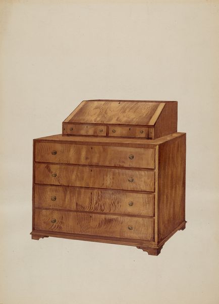 This Bishop Hill Square Desk by Archie Thompson is rendered with what looks like graphite or maybe colored pencil on paper. It's like he’s feeling out the object, the way the grain pulls your eye, and all the planes are softly lit. You can almost smell the wood, can’t you? The way it’s depicted, the surface seems smooth but not glossy, almost like it's drinking in the light. Look how the colors shift across the drawers, from a brighter, almost cherry-like hue at the top to deeper, richer browns towards the base. It gives the piece a sense of weight, of being grounded. And there's something so satisfying about the repetition of those drawer pulls, evenly spaced, each a tiny, perfect circle. It reminds me a little of Agnes Martin’s drawings, the way she built up a whole world from simple lines and subtle variations. It makes you see something you thought you knew in a totally new way. It's like seeing a really great cover version of your favorite song.