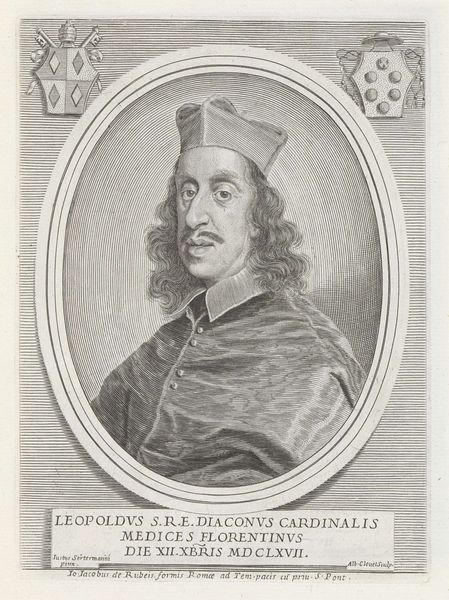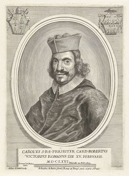 This is a portrait of Cardinal Carlo Roberti, created in 1667 by Albertus Clouwet using engraving techniques. The composition is dominated by the oval frame that encloses the Cardinal, emphasizing a sense of formality. The frame is flanked by heraldic symbols. The engraving employs a careful use of line and texture to convey the Cardinal’s vestments and facial features. Note how the varying densities of lines create tonal contrasts, giving depth to the figure. The inscription beneath the portrait functions as a signifier, encoding information about the sitter’s identity and status within the social and religious hierarchy. The geometric structure contrasts with the textured portrayal of the Cardinal. By examining these formal elements, we can consider how this print operates as a representation of power and authority, embedding cultural codes and values of the era. It invites viewers to decode its symbolic language.