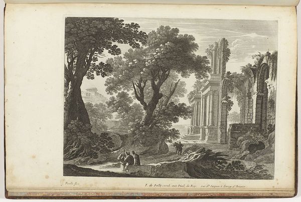 Editor: So, this is "Landschap met ruïnes en figuren," a print – etching and pen drawing – by Isaac de Moucheron, created sometime between 1677 and 1744. It feels… almost theatrical, with that ruined arch and the figures arranged like a scene on a stage. How do you interpret this work? Curator: The ruins are very important, aren't they? De Moucheron uses these fragments of the past—the crumbled arch, the scattered stones, the statue—as powerful symbols of cultural memory. Ask yourself, what did the ruined architecture mean to viewers in the 18th century? Editor: A reminder of the transience of power, maybe? The inevitable decay of even the greatest empires? Curator: Precisely! But consider too the figures amidst the ruins. They're not simply observing the decay; they're engaging with it. The artist is suggesting that even amidst ruin, life, art, and human connection endure. The allegorical figures gesture toward a lost history that they attempt to keep alive through gesture, pose, costume, and action. What of the landscape? Editor: It’s like the landscape is reclaiming what was once built, and that classical-realist approach lends this image a timeless appeal. Curator: Yes, and notice the placement of the figures near a source of fire. The warmth suggests resilience, suggesting that society is trying to recreate itself or protect itself from an element. The enduring human spirit is also on display within this piece! How interesting. Editor: I never considered all the potential connotations within each symbol; that opens up new interpretive avenues. It is almost like a puzzle of a history. Curator: And isn't that the beautiful thing about art? We can use these old-world images and their context to reimagine historical scenes and what the people truly went through!