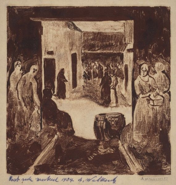 Curator: Here we have Théophile Alexandre Steinlen’s "Chanson du Soir," created in 1913. The artwork is an etching, and print depicting a figural scene. Editor: It's… wonderfully claustrophobic, isn't it? That dense, scratchy linework creates such a palpable sense of crowding and almost grim festivity. The faces are obscured, as if hidden within the dense crowd. Curator: Absolutely. The use of etching in this work amplifies the overall thematic elements, adding layers of meaning to Steinlen's art. Consider, etching as a medium is often associated with dissemination; therefore, it highlights how musical encounters are public rituals that gather various members of a social ecosystem into an event that, as this work portrays, can either bring comfort or angst. Editor: So, in that reading, the diffused light is not merely illumination, but the idea of a spotlight or surveillance of working-class leisure activities. I suppose the title – Evening Song – hints at that melancholy or even the potentially weary role of music. Are the people gathering seeking comfort or forced camaraderie in a setting that makes it almost difficult to find joy? Curator: Yes, that reading is absolutely valid and likely intentional. It captures the ambivalence that the symbolists sought to depict when discussing modern working-class realities and spaces. Notice how there's an abundance of people facing one another in dialogue, however the density of lines suggests an entrapment of those faces or emotional expressions to emerge, suggesting the symbol of community as also a burden. Editor: Interesting. This reminds us that visual representation is a constructed dialogue and cultural symbol that allows an artist to engage with contemporary culture. Steinlen really manages to push etching past conventional representation to become symbolic of larger anxieties around the changing landscape of the early 20th century. Curator: Precisely. The choice of the medium is far from arbitrary. The etching technique seems particularly effective for portraying both a sense of collective energy and the underlying social unease inherent in a seemingly candid depiction of working-class life. It's a very thought-provoking approach that shows social anxiety that comes with social gathering. Editor: Agreed. This print is a powerful commentary—a convergence of artistry, history, and symbol all meticulously etched onto the printing plate. Curator: Indeed, a great piece to ponder the visual construction of social rituals in art.