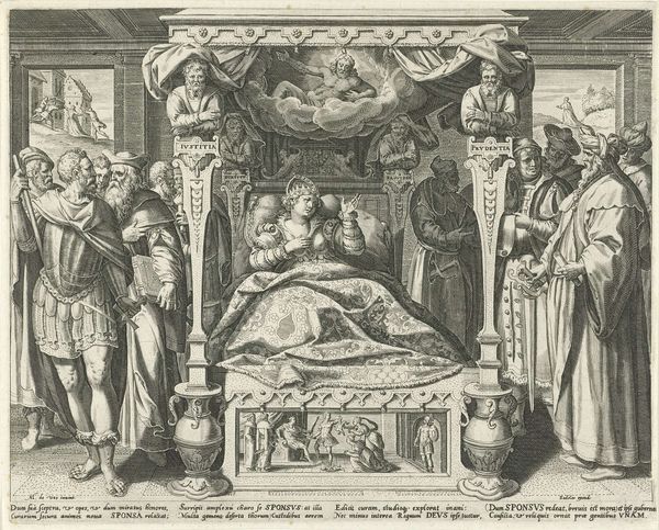 Cornelis Galle I created this engraving of ‘De heilige Norbertus, opgebaard in Maagdenburg’—Saint Norbert, Lying in State in Magdeburg—sometime before his death in 1650. The composition unfolds in layers of the earthly and the divine. Notice how the rigid lines of the architecture contrast with the ethereal clouds above. The scene presents the deceased Saint Norbert surrounded by mourners, his body displayed with emblems of his ecclesiastical power. Above, angels carry his soul towards a divine light. This division between the earthly and heavenly realms is structurally reinforced by the symmetrical arrangement of figures and objects around the horizontal body of the Saint. Through Galle’s engraving technique, we can see a discourse on the nature of death and sainthood. The rigid, controlled lines used to depict the earthly figures contrast with the more fluid, dynamic lines of the celestial beings, suggesting a transition from corporeal existence to spiritual transcendence. The artwork thus functions as a semiotic structure. It uses visual symbols to communicate complex theological concepts. It is an invitation to contemplate the boundaries between life and death, the sacred and the profane.