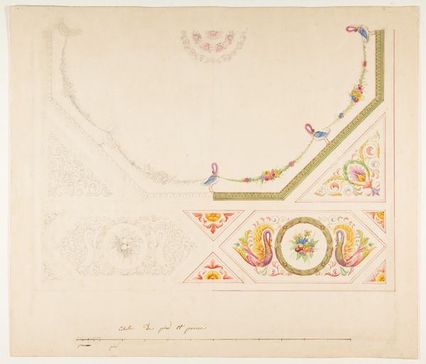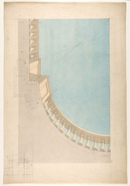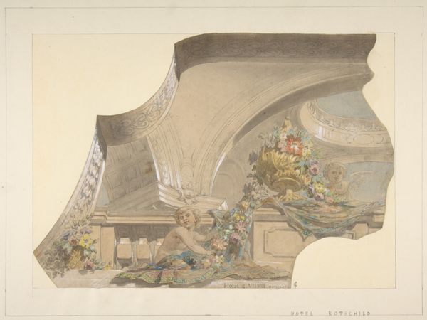 Editor: We're looking at a watercolor entitled "Design for a ceiling with trompe l'oeil balustrade and sky," created sometime between 1850 and 1900 by Jules-Edmond-Charles Lachaise. It feels so light and airy, like a dream of escaping upwards. What strikes you about this piece? Curator: It's fascinating how Lachaise uses the trompe-l'oeil technique – literally "trick the eye" – to create an illusion of limitless space above us. The balustrade, seemingly extending outwards, creates a false perspective. But what does that bird in the sky suggest to you? Editor: Freedom? Maybe the soul rising? Curator: Precisely. Birds have symbolized transcendence for millennia across numerous cultures. Consider also the tradition of painting the heavens on ceilings. What's being evoked for the viewer psychologically when they look up and seemingly through to an open sky? Editor: I suppose it offers a sense of optimism, of possibility beyond the confines of the room. A release from earthly constraints. Curator: Indeed. And look closely at the architectural elements: the ornamentation, the figures on the balustrade. What historical periods do these motifs call to mind? How might those symbols have shaped the perceptions of viewers then versus now? What feelings are you experiencing? Editor: The ornamentation makes me think of the Renaissance, a rediscovery of classical forms. Seeing it in this context makes it feel playful and a bit theatrical, rather than austere. This is much more than architectural drafting; it's pure storytelling. Curator: It is that conversation, across centuries, across art and experience. Editor: It’s incredible to think about how a single image can contain so many layers of meaning and connection. Thanks for walking me through this. Curator: My pleasure. Seeing familiar symbols in a new light always reignites my curiosity.
