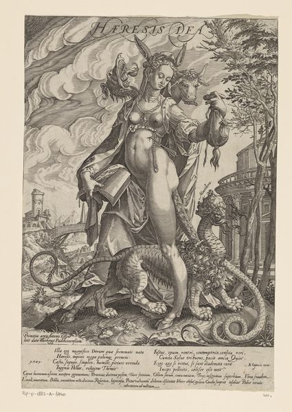 Editor: Here we have Hendrick Goltzius’s “Aarde,” an engraving from 1586. It strikes me as a powerful, almost assertive depiction of abundance, but also vulnerability. The figure, laden with fruit, seems almost burdened. What's your read on this engraving? Curator: The power dynamic between the representation of nature and its impact on the viewer is quite interesting here. Consider the period – this is late 16th century. Europe is emerging from religious conflict, scientific thought is challenging dogma, and art becomes a tool for projecting ideals of nationhood, wealth and control. "Aarde," meaning "Earth", aligns with that sociopolitical context. The cornucopia and the fecund landscape promote an idea of Earth’s capacity to fulfill human needs but the "burden" can also be understood as an argument for mankind´s responsibility for it. Editor: I see what you mean. It's not just about the bounty; it’s about control and responsibility at a time of immense social upheaval. The prominent nudity and classically inspired form contribute too, right? It reminds me of how rulers would commission portraits linking them to idealized historical figures. Curator: Exactly! Think of the institutions of art patronange during this period: Powerful families, nascent nation-states... The image presents a vision of terrestrial control to suggest earthly power. The public function of the arts shifted: The human body—idealized—stood for much more than religious morality or fidelity; it became intertwined with aspirations of terrestrial dominion. So how does the artist make us, the viewer, relate to "Aarde" politically? Editor: That's a shift in perspective I hadn't fully appreciated. Looking at it now, it does seem less a celebration of nature itself, and more a claim to ownership. Curator: Precisely. It showcases art’s inherent public role—consciously or not. And also prompts us to question: Who is represented? Who is empowered by this representation? Editor: Fascinating! It's made me see beyond the surface beauty of the engraving and understand the power structures it subtly reinforces. Thanks for this fresh approach.