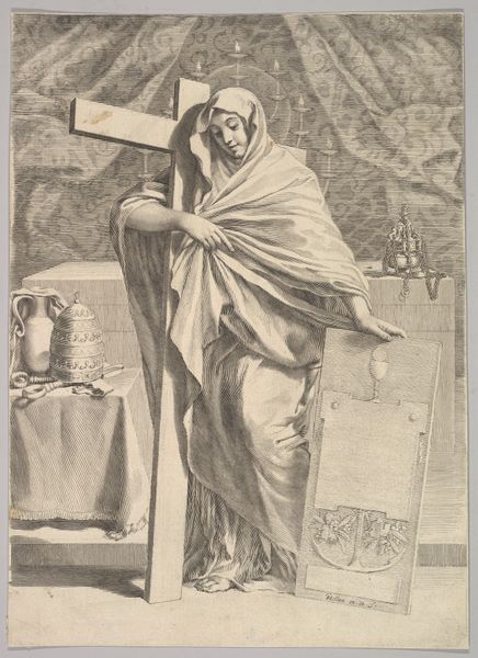 Editor: Claude Mellan's "Lamentation," created in 1683, really strikes me. The starkness of the engraving emphasizes the profound grief. What symbols or deeper meanings do you see woven into this scene? Curator: It's fascinating how Mellan uses the single line technique to evoke so much emotion. The Virgin Mary's gesture, arms outstretched, isn't just a sign of mourning. It recalls the ancient gesture of supplication. Consider how she mediates between the earthly realm, where Christ's body lies, and the divine light filtering from above. Does that division between earthly and divine echo through the work, in your opinion? Editor: Absolutely. The light almost ignores the earthly figures. It feels like a visual representation of their disconnect from hope in that moment. Is there significance in the other figures in the background? Curator: The figures attending the tomb become a sort of chorus, don't they? They represent the broader community of believers grappling with loss. Notice how their faces are obscured. This invites viewers to project their own grief and experiences onto them, creating a shared space of lament. Mellan is almost crafting a stage, and you're compelled to take part. Editor: So it’s less about depicting a historical event, and more about creating a space for collective grief. The image's enduring power is clearer to me now. Curator: Precisely. And think about the inscription on the tomb... the Latin phrase acting as a constant, unwavering reminder. These textual elements become an important element within the imagery, anchoring its significance within the moment. Editor: Thank you. This has given me so much to think about. I hadn't considered the interactive role the viewers play. Curator: My pleasure. Recognizing the symbolic language allows us to truly see the historical significance embedded in the work.