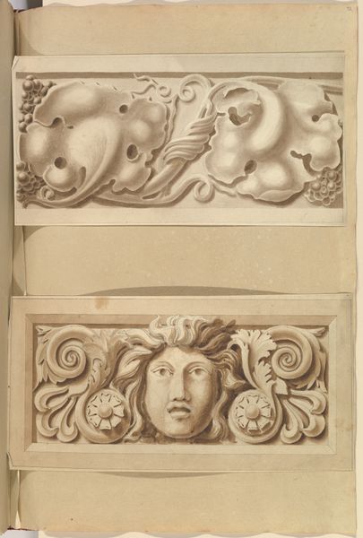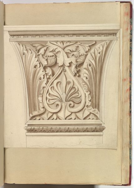 Editor: This drawing, "Carved Stone Ornamental Panel and Classical Female Figure" by Alfred Henry Forrester, likely dating from 1845 to 1870, combines pencil, watercolor and printmaking. I find the stark contrast between the detailed architectural panel and the miniature figure quite intriguing. What does this juxtaposition say to you? Curator: It highlights the evolving relationship between art, craft, and industrial production during the 19th century. Images like this circulated within a complex system of art education. The ornamental panel suggests a revived interest in classical design principles amidst rapid industrialization, serving as models for aspiring architects and artisans, to, in effect, mass-produce classical ornaments. Editor: So, it’s about more than just aesthetic appreciation; it's also about utility? Curator: Precisely! This piece provides insight into the art's accessibility. These images had value in spreading certain ideas of the time and creating access to high art for everyone to enjoy. This piece can be a starting point for thinking about cultural transmission, the status of classical forms, and the economic conditions shaping art production. Editor: That's a fascinating angle. It re-contextualizes the artwork and emphasizes the artist's intent in educating a generation during an era of intense socio-economic shifts. Curator: It’s also worth asking, who had access to these types of drawings, and what does that say about societal structures at the time? Whose stories were amplified and whose were silenced through this type of image circulation? Editor: I hadn't considered that aspect before. Thanks for the perspective, it really enhances my understanding! Curator: My pleasure! These types of artistic dialogues are vital to broadening our knowledge and interpretation.