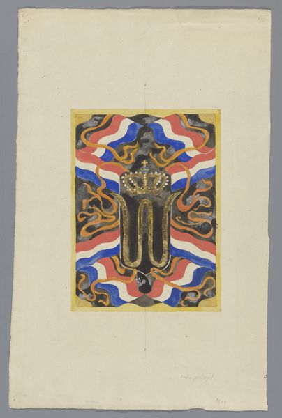 Carel Adolph Lion Cachet created this design with flags, banners, and a crowned W and B using pencil and watercolor on graph paper. The use of graph paper is intriguing; it suggests a translation of craft traditions into a modern, industrial aesthetic. The design process embraces this grid, highlighting the tension between artistic expression and mechanical reproduction. The rigid structure of the grid contrasts with the fluid, organic forms of the flags and banners. Cachet likely utilized the graph paper to scale his drawings for larger textile works. The flags, drawn with broad brushstrokes of watercolor, evoke a sense of movement and dynamism, while the crowned ‘W’ and ‘B’ anchor the design with regal symbolism. By using watercolor, Cachet was able to achieve a luminous quality that captures the spirit of national pride. The grid reminds us that even seemingly spontaneous designs are often the product of careful planning, labor, and a complex interplay of materials and techniques.