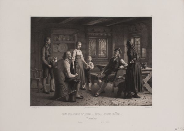 Curator: This engraving, "Verdeling van aalmoezen," or "Distribution of Alms," by Charles Billoin, dating from 1840, offers a glimpse into a carefully constructed scene of charity. It resides here at the Rijksmuseum. Editor: My first impression is the stark contrast—almost a duality—between the orderly, almost bureaucratic, distribution of aid and the apparent desperation and disorder of those seeking it. The rigid grid of the floor versus the huddled mass at the doorway speaks volumes. Curator: Precisely. The grid, or checkerboard pattern on the floor, leads our eyes intentionally to that back door, emphasizing the chaotic need pushing inward. Note also the subtle yet deliberate iconographic nods – the Virgin and Child relief above the fireplace, a gentle appeal to compassionate sentiment amid the scene's business. Editor: Yes, the placement creates an interesting interplay, drawing our attention upwards. Structurally, though, my eye keeps returning to the table. It anchors the entire composition with its sharp lines and the focused activity surrounding it. The papers, the counting – it is an island of purposeful administration. Curator: The "purposeful administration," as you put it, also reflects a cultural memory of societal structure. Billoin subtly uses the clothing of those seeking assistance to signify different social classes. One figure reminds me of Don Quixote with a certain antiquated valor. This speaks volumes about the historical understanding of poverty. Editor: Indeed, one can almost see a narrative of shifting social hierarchies represented here through textures, both literal and figurative. Curator: What the viewer sees depicted here really creates that important discussion. Perhaps one that society has wrestled with through many centuries. Editor: A rather well designed composition and one that lends itself to endless interpretation.