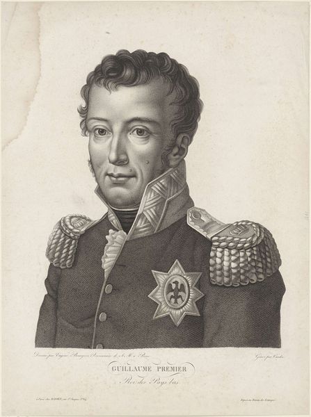This is Jacob Ernst Marcus’s portrait of Willem I Frederik, King of the Netherlands. It’s a monochromatic print, with a subtle tonal range achieved through fine lines and hatching. The oval composition is neatly framed against the plain paper, creating a formal, almost classical, feel. Marcus masterfully uses line and form to convey not just likeness, but also a sense of authority and composure. The precise, controlled lines define the King's features with clarity, while the shading adds depth, giving the face a three-dimensional quality. His gaze is direct, his expression serious, all contributing to an image of leadership and strength. The structure here invites us to consider how rulers were visually represented during this period. The focus on linear precision and the clear depiction of form serve to reinforce the subject's status and power. This is not just a portrait; it is a carefully constructed image designed to project specific qualities about the sitter and the values of his reign.