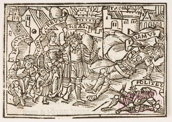 Curator: This is Illustration LII from the Harvard Art Museums, created by an anonymous artist. It depicts a very well known tale: the story of the Trojan Horse. Editor: Immediately I get a strong feeling of narrative, like a scene plucked straight from a play. There is a crude, almost theatrical quality to the figures. Curator: Indeed. The woodcut medium lends itself to such bold simplicity. The inscription "Troia" above the city gate underscores the historical context, reminding us of the enduring power of classical narratives. Editor: And the way they’re all crammed together gives it this delightful, almost claustrophobic tension. It really does capture that sense of impending doom, doesn't it? Curator: Absolutely. The artist successfully conveys a significant historical moment, capturing the essence of both triumph and tragedy through this limited but powerful medium. Editor: A perfect visual shorthand. It's like a snippet of memory rendered in ink. Gives you chills, doesn't it?