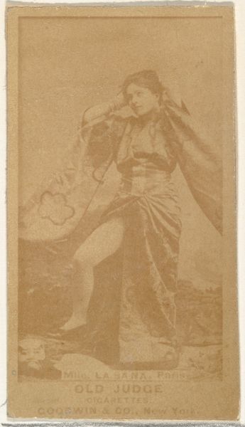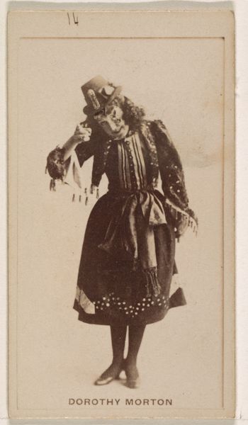 Editor: This is “Bessie Lynch, from the Actresses series,” an albumen print from 1890 by Kinney Brothers, intended as a promotional card for Sweet Caporal Cigarettes. There’s something so evocative about these ephemeral objects; Bessie herself looks regal and somewhat melancholic. What sort of symbols and imagery stand out to you here? Curator: It's interesting that you pick up on that melancholy. Consider how tobacco, pleasure, and the performance arts intersect. Bessie Lynch, adorned in what appears to be theatrical costume, becomes a symbol of fleeting beauty and transient enjoyment, much like the ephemeral puff of a cigarette. Do you see how the floral elements of her clothing allude to this ephemeral quality of life? Editor: Yes, the floral details and elaborate costume certainly lend a performative, almost staged, feeling to the image. The feather in her hair especially. Curator: Precisely. Think of how actresses, in their roles, embody various archetypes and emotions. Lynch, by being part of this “Actresses” series, is turned into a type of modern icon, signifying entertainment, desire, and the power of image. She becomes more than just a portrait; she’s a stand-in for all actresses, for performance itself. How does the commercial intention play into the reading? Editor: That's a fascinating point. The cigarette company is selling an idea, a fantasy tied to this glamorous figure. The symbolism is being leveraged for marketing, connecting Bessie's image with aspiration. It's almost a form of secular icon worship. Curator: Exactly. Kinney Brothers harnessed her likeness, infusing the everyday act of smoking with a sense of sophistication, aspiration, and, perhaps subtly, a dash of tragedy. In a way, Bessie Lynch becomes a cultural artifact of her time. Editor: I never thought of it that way, but it makes perfect sense. The commercial context shapes the symbols we see. Curator: These visual echoes give us a rich perspective on that bygone era. Thank you.