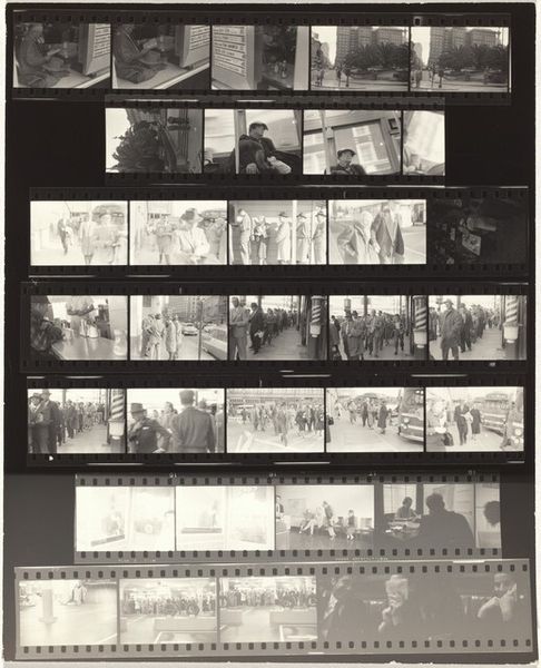 Curator: This gelatin silver print, titled "Guggenheim 560--Los Angeles" was captured by Robert Frank in 1956. What’s your first reaction to this striking series of images? Editor: Initially, it feels like peering into someone's memories, fragmented yet strangely cohesive. There’s a cinematic quality, a sense of stories unfolding. A somber feeling overall, don't you think? Curator: It’s interesting that you describe it as memories, it evokes exactly the feeling that Frank wanted to communicate: cultural memory, through familiar symbols, with an emotive impact that hits straight to the collective imagery. The Guggenheim referenced in the title alludes to the artist’s application for a grant. Editor: So, a visual grant application, a series of vignettes! Knowing this helps re-contextualize the string of images. Suddenly the photograph takes another role, as some sort of urban planning representation and documentary. Are there visual motifs connecting the disparate scenes? Curator: There is a focus on street photography that seems to recur as a connecting element throughout the frame series, along with architectural themes and a prevalent use of black and white tonality which brings a feeling of loneliness. Frank developed a unique style characterized by spontaneity and a candid approach to street photography, diverging from the more formal style predominant then. Editor: I find it fascinating how those monochrome tones and snapshot-like compositions can distill such complex social narratives. He truly transformed mundane scenes into potent social commentary. And also there is a certain similarity to cinema stills. Do you agree? Curator: Indeed! By choosing photography as the primary tool, and a fragmented approach to street representation he offered to America and the rest of the world a social criticism that still feels quite relevant today. But beyond any conceptual implication, there is the powerful presence of light itself. Editor: Well said. It really does transcend just a string of pictures—it's a poignant visual poem. I will certainly reconsider it when passing by an exhibition with Robert Frank’s artworks. Curator: Precisely, an opportunity to not only look, but feel. And now hopefully, our listeners can too.
