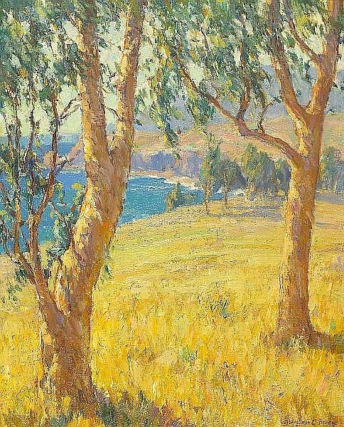 Editor: We’re looking at Benjamin Brown’s “Laguna Vista” from 1915, an oil painting that immediately evokes a sense of calm and warmth. The brushstrokes are visible, and the scene feels bathed in a golden light. How do you interpret the symbolism in this piece, or what stands out to you as particularly meaningful? Curator: This work strikes me as a visual poem about California, not just as a physical place but as a state of mind. Notice how Brown frames the vista through the trees – almost like looking through a sacred grove. What do trees often symbolize? Editor: Hmmm… connection to nature, growth, life... Curator: Exactly! And the water – vast, serene – that is often a symbol of renewal and the subconscious. Think about the Laguna coastline during this era. Artists were drawn to its beauty but also the promise it held, the “California Dream.” Brown’s work isn’t just a landscape; it’s an invitation. Editor: An invitation to what, exactly? To move there? To appreciate beauty? Curator: Perhaps it's an invitation to contemplate one's place in the world, mirroring how these landscapes beckoned westward migrants seeking new beginnings. And consider the time it was painted – 1915. Europe was engulfed in war, while California offered refuge, a sunny alternative. It’s an image imbued with longing for peace. Does that add another layer for you? Editor: Definitely! Seeing it as a kind of hopeful counterpoint to the war…it’s more than just pretty scenery then. Curator: It uses readily legible symbolism to offer something deeply moving. Its success lies in inviting us to imprint our hopes and memories onto that iconic vision. Editor: That gives me a lot to think about regarding the power of symbols and cultural memory embedded in landscapes. Thank you.