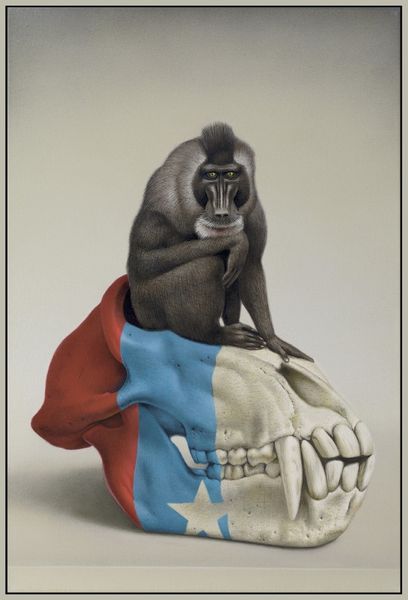 Curator: What immediately strikes me is this incredible, almost eerie serenity, despite the vibrant yellow wash. There's a peculiar, unnerving gentleness to it. Editor: Unnerving is right. We're looking at Eckart Hahn's "Yellow," painted in 2019 with acrylics. The portrait format highlights a chimpanzee gazing downward, holding what appears to be a short piece of rope. That monochrome yellow makes the figure appear oddly ill, evoking conversations around animal exploitation and forced environments. Curator: Or a rather fabulous creature from a forgotten land! The uniform yellow really throws your senses for a loop. It softens the wrinkles, highlights the fine fur… It’s like looking at a memory, vivid but undeniably… other. It tickles the imagination. Is it sadness or gentle curiosity in those eyes? Editor: The almost human-like expression does humanize the animal form, blurring boundaries between species. I think that begs consideration of power dynamics: zoos, laboratories, performances… the rope adds a layer of implied control and the loss of agency for animals under human captivity. It’s heavy. Curator: Heavy, yes, but also… hopeful, maybe? I mean, look at the delicate fingers almost playing with that rope, and the way the light catches the edge of its ears. Hahn manages to freeze a complex moment with such unsettling tranquility. It’s an open door for introspection. Editor: I appreciate you seeing a thread of optimism! For me, the striking, almost sickly use of a singular, intense yellow can serve as a call to address animal welfare, and the long shadow of colonial scientific practices, particularly in fields like primatology. The visual disruption can make a statement. Curator: It definitely messes with your head, and that's probably what Hahn intended. The unexpected color asks you to reassess the familiar. It encourages a kind of raw, instinctual seeing. It stays with you long after you walk away, that bright haunting presence. Editor: Agreed. Whether approaching Hahn's “Yellow” through emotion or social commentary, there’s an indisputable engagement. It’s an unsettling piece that makes us contemplate, in both obvious and subtle ways, our relationship with the non-human world.