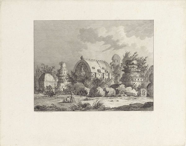 Curator: Look at the delicate lines in this etching by Daniël Dupré, titled "View of a City Gate," made sometime between 1771 and 1817. Editor: My first impression is one of quietude, even isolation. The image has this almost dreamlike quality to it, rendered in such fine detail. It’s quite small, isn’t it? The world feels so distant here, as if glimpsed through a hazy memory. Curator: Indeed, its intimate scale enhances that sense of looking into the past. Etchings like these were often made for print series documenting places and served a dual purpose as artistic creation and historical record. Notice how Dupré uses the contrasting areas of light and shadow to emphasize the architectural features, like the solid tower or the inviting city gate. To me it feels a celebration of enduring structures. Editor: But I see more than just celebration, I see power. City gates throughout history are the ultimate power symbol, especially for disenfranchised communities excluded behind it or subjected to unjust rules beyond it. It suggests not just what is being kept in, but what is also kept *out.* Are the towers then also signs of resistance? How might communities identify with, against, and through such strong architectural markers? It speaks to social control in that sense. Curator: That's a very compelling observation. You're drawing attention to how power and security can be interpreted. In the context of late 18th and early 19th-century Europe, many sought comfort in images of established order amidst political upheaval. The city gate and the solid tower could represent not only protection but also nostalgia for an imagined stability and continuity with the past. In this sense it takes on the role of psychological anchor during moments of societal change. Editor: Exactly. I can see both—the artistic intent and its reception. This conversation makes it such a nuanced piece of artwork that still speaks powerfully today about the structures in our life. Curator: It invites us to ponder both history and its emotional weight as symbols shift across time.