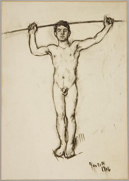 Eugène Jansson made this study of a male nude, probably with charcoal, sometime in the late 19th or early 20th century. It's all about light and shadow, this push-and-pull that gives the figure its volume. Check out how the charcoal dust hazes softly around the figure, especially behind the head and torso. It almost feels like the figure is emerging from the darkness, or maybe dissolving back into it. And then there are the lines themselves – these scratchy, almost frantic marks that define the contours of the body. They're not trying to be perfect, they're searching for the form, feeling their way around it. Look at the hand that is resting on his hip. Jansson uses shadow to give the impression of its form. It’s like he’s saying, "Here's a body, in all its messy, imperfect glory." You could say it recalls the work of Anders Zorn, who also had an interest in depicting the human form with a clear, sensual gaze.