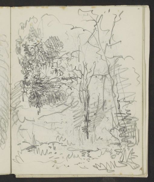 Curator: Immediately striking! There’s something almost ethereal about this sketchy landscape. A hazy quality, like a memory fading at the edges. Editor: And a valuable glimpse into an artist’s process. What we see here is “Landscape with Water and a Plant-covered Stairway along a House” by Maria Vos. She worked on this piece between 1834 and 1906. It's a pencil drawing, currently held at the Rijksmuseum. Curator: I’m drawn to the contrast between the meticulously rendered stairs and the almost vaporous treatment of the water and foliage. What do you make of it? Editor: The romantic ideals of the time might have influenced it, which suggests the significance of nature's sublime beauty and the power it holds to shape emotions, even amidst a somewhat derelict built environment. Curator: Exactly, and the plant-covered stairway itself becomes a symbol. Think of a personal ascension, a spiritual reaching. Note how nature reclaims human spaces, creating this cyclical harmony. It hints at hidden knowledge, as it ascends to who knows where. Editor: From a historical perspective, sketchbooks like these provide insights into the artist's influences and even broader societal trends in appreciating the landscape. This might indicate new public accessibility and appreciation for previously unseen local views. Curator: I can imagine Vos stopping during one of these explorations. To catch the fleeting mood. What looks like an old well and fountain becomes a place of imagination. Editor: I’m struck by how something so seemingly simple on its surface becomes deeply layered through further contemplation. Maria Vos's hand lends beauty even to decay. Curator: For me it really highlights nature's capability to imbue our environments with spirituality. Editor: Indeed. It reminds us of the transient beauty all around us. And this single image reveals that even preliminary works offer much insight.