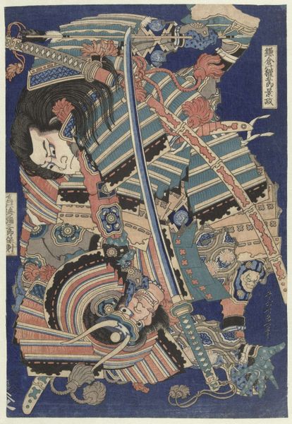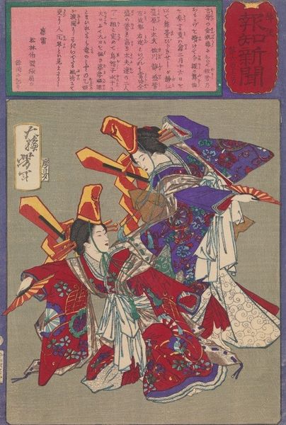 Curator: This dramatic print by Tsukioka Yoshitoshi, created in 1883, depicts Minamoto no Ushiwakamaru Battling with the Brigand Kumasaka Chōhan. Editor: My initial reaction? Dynamic and full of tension. The contrasting textures and patterns, combined with the tilted figures, immediately draw me in. There's a vibrant discordance. Curator: Indeed. Yoshitoshi's placement of this legendary fight against the backdrop of socio-political change speaks volumes. Ukiyo-e prints such as this had evolved beyond mere depictions of daily life. The medium became a repository for stories about historical figures, functioning as cultural and patriotic symbols during the Meiji Restoration. Editor: I am taken by the lines, the bold outlines emphasizing the movement and energy. See how the lines defining the figures’ garments are contrasted by flat colored segments? It gives a unique structural rhythm. How do we understand the combination of stylization and relative naturalism in Yoshitoshi? Curator: It points towards the changing tastes and audiences for such prints. While maintaining ukiyo-e aesthetics, there was also growing interest in accurate representation and historical themes as a form of cultural storytelling for a public now oriented toward an emerging modern nation. Editor: Consider the color palette. The somewhat subdued background brings forward those floral patterns on the cloth, the elaborate armor. Note, too, how it echoes similar floral motifs on the garment of the boy warrior: The chromatic harmony here emphasizes not a contrast, but the deeper connection between two formidable figures. Curator: Precisely. What we observe here is not just a clash of swords, but a meeting point between older legends and modernizing sentiments. The popularity of images like this shows us how traditions can be invoked to negotiate new cultural identities. Editor: Analyzing Yoshitoshi's formal approach reveals the layered meanings held in the very structure of this woodblock print. A remarkable demonstration of narrative complexity within an aesthetic of calculated asymmetry. Curator: Absolutely. It has demonstrated to me that considering artistic shifts like this artwork enables a much deeper comprehension of the forces that once drove the society it came from.