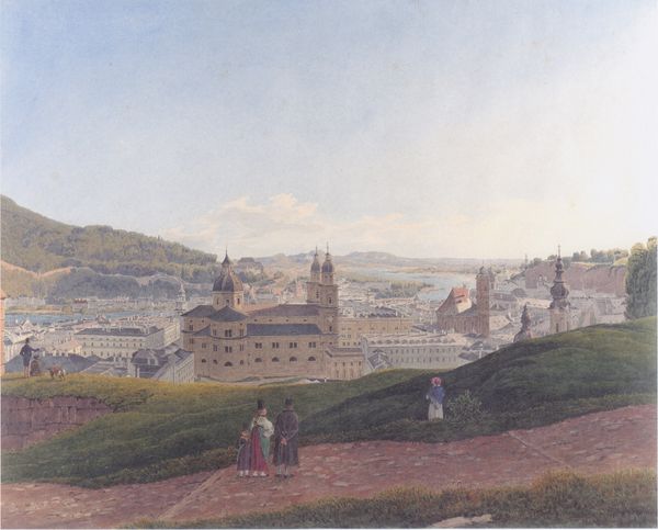Curator: This is Josef Höger's "Eichhorn Castle at Evening," a watercolor and pencil drawing created around 1838. Editor: There's something wonderfully melancholic about this piece. The soft hues, the imposing castle dominating the hilltop – it all contributes to a sense of fading glory and bygone eras. Curator: Indeed. Höger, working within the Romantic tradition, was deeply interested in capturing not just the physical appearance but also the feeling of a place. He has made use of watercolor to soften and evoke emotion. Note the careful detailing, especially on the castle's facade; however, its very location atop a formidable natural barrier tells a longer story about resource and labor management during castle construction and maintenance. Editor: The castle certainly becomes a dominant symbol of power and perhaps also of protection, even if now slightly dilapidated. Castles represented a way of organizing the medieval world into an intelligible hierarchical social structure, almost a beacon of that feudal structure. The setting itself, a dense forest, feels like a timeless space—a sort of visual metaphor for historical continuity. Curator: Exactly. Consider the watercolor technique as well. Its very nature, that translucence and layering, speaks to fragility, while the underlying pencil work reinforces the intent of precision that reflects an industrial desire. How else would one survey the scene or set the parameters of one's dominion without technical drawing aids? Editor: Fascinating point. Now I also note that a subtle, serpentine path winds its way up to the fortress, beckoning us—the viewers—toward it. Curator: It highlights the connection between those working and travelling the space of the locale at the base with that fortress towering above. A castle cannot thrive without human capital in its construction, staffing, and providing of resources. Höger makes the workers almost integrated into the hillside; how he renders them and their daily routines are not detached from the physical location and labor needed to sustain an entity of dominance such as this one. Editor: Ultimately, the artwork reveals the ways in which symbols and the very physical qualities of creation, water, pencil, and the landscape contribute toward a collective cultural memory. Curator: Absolutely. Reflecting upon the role of landscape and material further enhances one's perspective of the social function of artwork such as Höger's as we consider landscape as a reflection of the needs for industrialism during this time period.