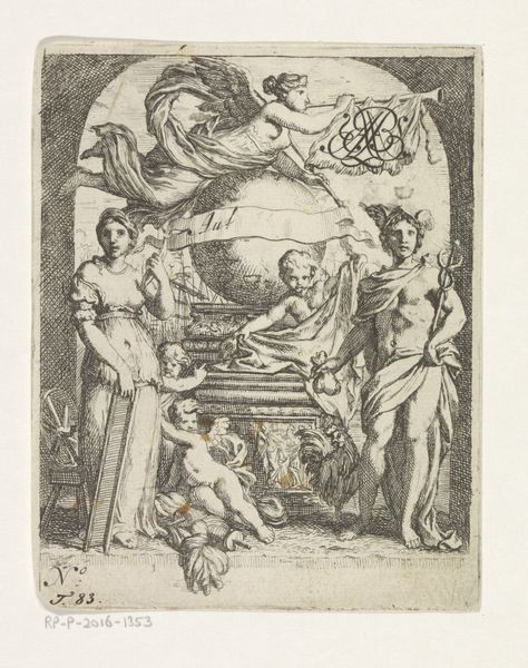 Joseph de Longueil created this print, "Decembre," around 1770 as part of an iconological almanac. The scene, framed by a precise border, invites contemplation through its formal arrangement. An androgynous, winged figure dominates the composition, holding a shield emblazoned with the sign of Capricorn. The figure, rendered with fine lines, embodies a semiotic bridge, linking classical allegory with the practical function of the calendar. To the left, infant-like figures play, while a boar feasts on fallen nuts to the right, symbols perhaps, of innocence and indulgence. These elements are meticulously placed, creating a balanced yet dynamic tableau. The subtle gradations of light and shadow, achieved through delicate hatching, add depth and texture. The print's visual clarity encourages a dialogue between form and content, tradition and innovation. This structured approach doesn't just depict December; it interprets it through a complex interplay of signs and symbols, reflecting the intellectual currents of its time.