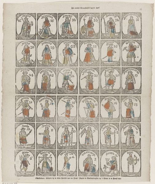 This is a broadside made by Drukkerij Landbouwkundig Gesticht, featuring various figures organized by social rank and profession. The images are simple but evocative, each labeled with their title, from ‘Keizer’ to ‘Dood,’ or Death, each holding a symbolic object related to their role. Consider the figure of the soldier: standing with a sword and shield, this symbol of defense and order echoes across millennia. We see it in ancient Greek hoplites, Roman legionaries, and medieval knights. Over time, the soldier transforms—from a symbol of civic duty to a figure of imperial power. The image of death embodies a profound psychological weight. The grim reaper is found in various cultures throughout history. This representation taps into our deepest anxieties and collective memories. The image serves as a reminder of mortality. The use of simple figures highlights the powerful psychological impact that archetypes and symbols can have. These are not merely illustrations, but carriers of cultural memory.