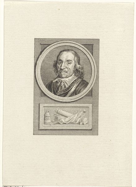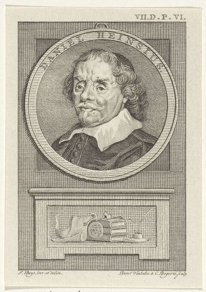 Editor: Here we have "Portret van Joost van Vondel" by Reinier Vinkeles, an engraving dating back to sometime between 1783 and 1795. It strikes me as quite formal, with that strong neoclassical influence...What stands out to you about this piece? Curator: For me, it's the materiality of the print itself. Think about the labour involved in producing this image. Each line, carefully etched, meticulously reproduced. It speaks volumes about the consumption of imagery during that time, the mechanics of creating and disseminating these portraits. Editor: So you’re seeing the engraving as a manufactured object more than as a...representation? Curator: Precisely. The subject matter, Joost van Vondel, the prominent poet – he’s almost secondary. What’s primary is the act of creating and distributing this image to a wider audience. Consider the engraver's role within the art ecosystem, the division of labour, the marketplace for prints. How does the 'originality' of a painting compare with this reproduction made for consumption? Editor: That makes a lot of sense. I was focused on the neoclassical style, but the way it was made and how it was circulated changes things. So how does understanding it through production impact our viewing? Curator: It reveals art not as the isolated genius of the artist, but a web of material conditions, labour, and consumption. We appreciate the means, instead of purely aesthetic ends. What could this tell us about the relationship between craftsmanship and artistic reputation at that time? Editor: I hadn’t considered it that way before. I’m now wondering about the kind of audience who would consume engravings and what kind of cultural and economic access they would need to buy it! Thanks for the fresh view! Curator: Absolutely! Looking at the mechanics provides us new dimensions of this work.