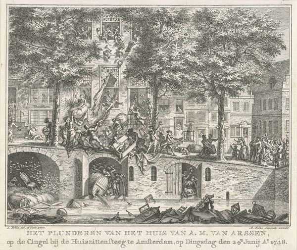 Editor: This is Adriaan Gerrit van Prooijen's "Allegory on the Return of Stolen Art and Science Objects to Antwerp, 1815", created in 1821, using engraving techniques to create this print. It feels incredibly formal and staged, almost like a theatrical production frozen in time. How do you interpret this work through a formal lens? Curator: The immediate impact of this engraving resides in its meticulously structured composition. Observe the stark contrast between the figures in the tent on the left, the procession emerging from the central archway, and the seated man reading to the right. The line work itself—so precise and controlled—contributes to the overall sense of order. How does this rigid structure impact your reading? Editor: It creates a strong sense of division. The composition uses the architecture of the arch and even the winged figure to separate these figures from each other. The line quality varies so much; how do we account for those sharp differences? Curator: Precisely. The crisp lines of the architecture, contrasting with the softer rendering of the figures, especially those on the cloud, introduce a compelling visual dichotomy. The varying line qualities emphasize different textures, guiding the viewer’s eye strategically across the artwork’s surface and highlighting spatial relationships. What do you notice about the central arch in relation to everything else? Editor: Now I see that the arch acts almost as a proscenium, framing a return in progress. It's creating another play within a play. The more sharply rendered architecture creates the real space of action with a play or drama superimposed on the main scene. This also links to a contrast between our space and this "play space." Curator: Yes, this tension between stark linearity and softer figuration establishes a dynamic rhythm throughout the composition. Through an interplay of textures, van Prooijen elevates a historical event to the level of formal artistic discourse. Editor: Seeing it like this illuminates aspects that would have remained unseen to me if focusing on anything besides its form and structure! Curator: Exactly, analyzing structure illuminates unseen ideas, enhancing understanding through its arrangement.