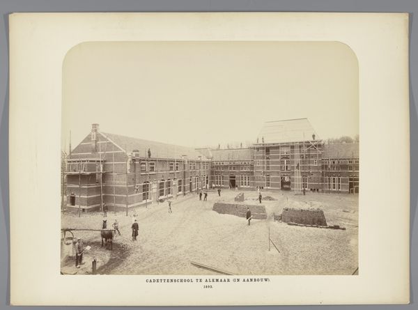 Curator: It feels sepia-toned with serious Dutch respectability; perfectly symmetrical and proper but drained of almost all vitality. It's like the buildings are exhaling starch. Editor: This gelatin-silver print from 1893 depicts the Cadettenschool in Alkmaar. The photographers, C. van der Aa and J. Chrispijn, have captured more than just buildings; they’ve documented an institution, an idea. Notice how the architectural forms are not just aesthetically pleasing, but structurally imposing and severe? Curator: That’s the perfect word—severe. There's not a single playful angle or ornament anywhere. It’s a kind of visual dogma that’s both impressive and a bit oppressive. I'm drawn to the light, though—it's even and unflinching, but there are some interesting plays with texture in the brickwork. Editor: Exactly. These institutions and civic structures reflected—and still reflect—the values of the state. This academy’s imposing structure broadcast power and instilled discipline. The building material itself—those austere red bricks and geometrical construction—speaks of order and a rationalist view of progress so prevalent at the time. It also visually communicates the purpose of such places during this rise of nationalism. Curator: Thinking about it, photography itself contributed to that institutional mindset. Everything so clearly categorized, labelled, presented for inspection—the very act of capturing an image implies a sort of power and control. Look how insignificant those little figures appear on the lawn! Editor: The figures are almost an afterthought. Scale is deliberately used here to portray dominance of state over individual. And by immortalizing that physical dominance on the photographic print, it underscores its seemingly timeless nature. It implies a sense of permanency. Curator: It makes you wonder about all the invisible structures in our lives, doesn't it? And who is choosing how and what we perceive to be "real." Still, for all its weight, I keep finding the interplay between hard lines and soft light subtly captivating. Editor: A poignant reminder that architecture isn’t just about bricks and mortar, but reflects, embodies and also constructs, social order. Perhaps we all should look a bit harder at the buildings we pass, they communicate just as much as any propaganda piece.