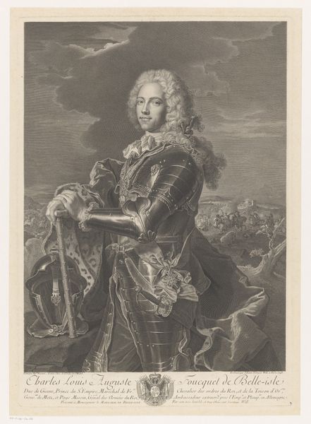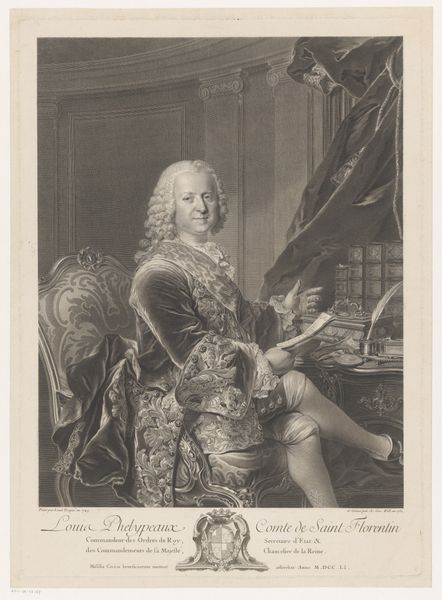 Editor: So, this is Georg Friedrich Schmidt's "Portrait of Georg Dietloff von Arnim," created in 1756. It's an etching and engraving, currently residing in the Rijksmuseum. My first thought? He looks rather… pleased with himself. Very Baroque in its pomp and circumstance. I wonder, what catches your eye about this piece? Curator: Oh, he absolutely *glows* with self-satisfaction, doesn't he? I mean, between the powdered wig and the Lady Justice statue looming behind him... It’s almost comical! It's like a perfectly orchestrated stage play, carefully constructed to project power and importance. You see it a lot in portraiture of the time – almost aggressively posed to impress. It makes you wonder about the person underneath, doesn’t it? Is it him, or a role that he’s been asked to perform? Do you feel the sitter gives us something to reflect on today? Editor: I think so, the performance part for sure. So much emphasis on outward appearances, makes you wonder what he was hiding. The contrast between the lightness of his wig and robes with the darkness in the background…it’s almost theatrical! Curator: Exactly! The "theatrical" element! Baroque was ALL about drama, using light and shadow to emphasize form. Now notice how Schmidt handles the engraving, look at the textures. Think about the sheer *skill* needed to render those lace cuffs and the details on the velvet coat! Editor: Wow, yeah, the details are incredible! So much precision. Curator: It's an exercise in control and presentation, perfectly reflecting the mindset of the aristocracy. A man shaping his legacy, etching it—literally!—for posterity. It's pretty incredible! Editor: So it's not just a portrait, it's a statement. It definitely gives you a lot to think about. Thanks for sharing!