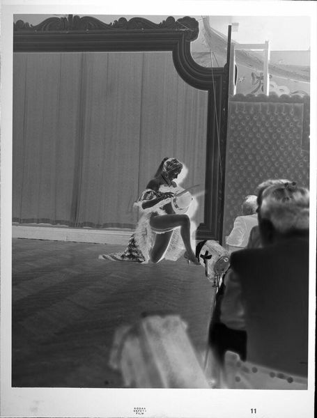 Curator: This is an untitled photograph by Peter James Studio, depicting two dancers on a stage. The print measures about 10 by 12 centimeters. Editor: It’s immediately striking. The stark contrast creates a sense of drama, a story unfolding. I'm drawn to the dancer's pose – a vulnerability, perhaps? Curator: The composition certainly directs our attention there. The image, while modest in size, speaks to the larger history of representing performance and the body in art. Consider how theatrical spaces have, for centuries, been stages for social commentary and the negotiation of identity. Editor: I see it. The striped shirt of the standing figure, almost like a uniform, is interesting too. It lends a slightly sinister air, a sense of imposed control. Is this about power dynamics, maybe? Curator: Possibly. Photography has always played a role in shaping perceptions of performers and the performing arts. This image invites us to consider the photographer's gaze and how it constructs meaning. Editor: It makes me think about the fragile nature of performance itself. All that emotion and movement captured in a single, still image. Curator: Indeed. It's a reminder of art's capacity to freeze moments in time, prompting reflection on their cultural weight. Editor: The visual language of the stage is powerful, even in this small, almost ghostly image.