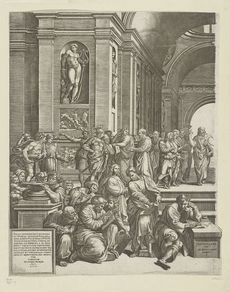 Editor: This is Luigi Ademollo's "An Antique Sacrifice," likely created as a drawing and print around the 1820s. The figures and architecture fill the space, creating a striking balance between the activity at the center and the detailed ornamentation around the room's perimeter. What draws your eye in this composition? Curator: Notice how Ademollo employs line, not just to delineate forms, but to build value, create texture, and articulate space. Look, for instance, at the rendering of the garments and the complex, repetitive designs on the architecture behind. Where does your eye tend to linger within this array of forms? Editor: I find my eyes jumping from the people near the center, who seem to be enacting the "sacrifice," up to the statue of the man, and back down. There’s so much detail! Curator: Indeed. That tension – the spatial relationship between foreground and background – invites a continuous visual journey. What is the affect created, for you, by this combination of line work, layering and that contrast? Editor: It makes it feel almost dreamlike and difficult to decipher because of the many, fine details. Do you think the difficulty is intentional? Curator: Let us observe the meticulous orchestration of line. Its interplay fosters a dynamic visual experience. One could also posit a dialogue between precision and elusiveness. The lines suggest much, yet also invite speculation. This might align with larger notions within neoclassicism regarding how meaning is produced. What is your assessment of the surface appearance of this work of art? Editor: I see what you mean. Focusing on the artist's technique has really changed how I understand this piece. Thank you. Curator: Similarly, attending to an artwork's formal devices yields meaning beyond subject matter, which I think we both accomplished here.