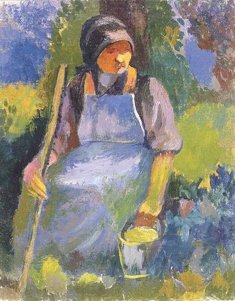 Curator: Here we have Camille Pissarro's "Seated Peasant Woman," painted circa 1880. Notice how Pissarro employs oil on canvas to depict this rural figure within a landscape setting. Editor: What strikes me immediately is the palpable weight of her posture. She’s hunkered down, almost burrowing into the earth itself, you know? It's like the land is both her burden and her refuge. Curator: Precisely. The composition utilizes a muted palette, dominated by earthy tones that echo the landscape. Her clothing mirrors the hues of the soil, integrating her visually with the ground. The tree acts almost like an emotional frame—a dark, twisting sentinel. Editor: It’s interesting—the face is in shadow, almost deliberately obscured. Pissarro’s not giving us a sentimental portrait. This isn't about individuality, it's about a shared experience, an anonymity that elevates her into something archetypal, perhaps? Curator: One might analyze it through the lens of Realism; Pissarro does not romanticize rural life. Rather, he presents an unvarnished depiction of labor and existence, a formal experiment around everyday life. Editor: The house, tucked away in the background, that one spot of vibrant red on the roof! Is it a promise of warmth, or maybe just another symbol of an unending grind? It adds such a subtle but essential visual element. Curator: It creates a spatial depth, certainly. Moreover, the brushstrokes, though characteristically Impressionistic, are quite deliberate here, reinforcing the solid, grounded nature of the figure. Editor: There's this feeling of quiet contemplation, of a woman drawing strength from the very earth beneath her. A profound meditation disguised as an everyday scene. Curator: I find the absence of overt emotion the painting's most salient point. The painting operates on restraint— inviting viewers to construct meaning through careful observation. Editor: Indeed. It's a masterclass in using quietness as its most expressive tool, isn't it? Pissarro really let’s the landscape, the light, and that weighty stillness tell her story. Curator: Agreed, and that subtle manipulation makes all the difference here.