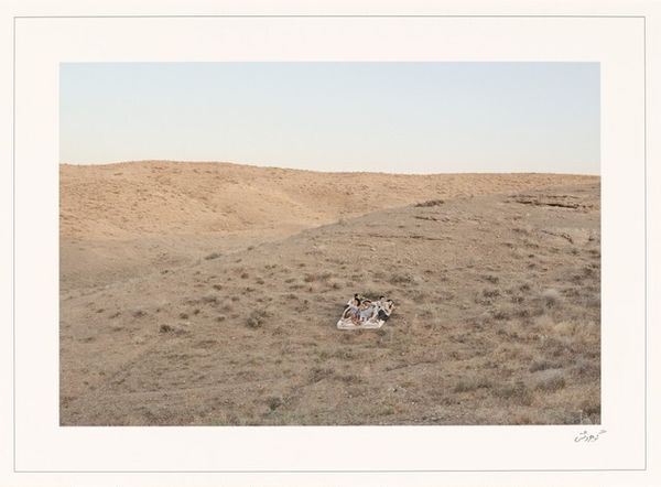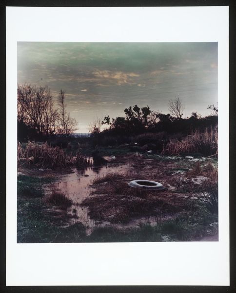 Editor: This is Terry Evans’ "Area burned as part of prairie management program," taken in 1999. It's a photograph, split into two panels, showing a landscape of burnt prairie. I’m struck by how the golden light contrasts with the dark, charred earth, giving it a sense of both devastation and renewal. What catches your eye? Curator: The diptych form is immediately interesting. Consider how Evans employs it; does the division create tension, or does it encourage a comparative reading of the landscape elements within each panel? I am drawn to the visual relationships established by the composition. Notice the horizon line; how continuous it is, and what affect that creates? And the artist’s shadow bisecting one panel… Editor: I see what you mean. The continuous horizon does create a sense of unity, but the shadow definitely disrupts that, drawing attention to the artist’s presence and intervention. Is the formal disruption significant? Curator: It is important to observe the tension between pictorial space and surface. Evans is playing with formal devices, flattening pictorial space even while employing light and shadow. Also, let us think about that contrast: the textures and light of the unburnt field with the burnt field where Evans's shadow is cast. What do you observe? Editor: The contrast definitely emphasizes the dual nature of the scene: destruction and the promise of new life. The interplay of light and shadow is really compelling here, especially because you pointed out Evans' flattening pictorial space. Curator: Precisely! The semiotic analysis of shadow indicates something deeper. The composition itself—the contrasting planes and use of light—becomes a powerful language. Editor: That's fascinating. I never considered photography in terms of formal language so directly. Curator: Indeed. Attending to visual clues facilitates profound observations. I will consider the play of space and shadow when evaluating the composition from now on.