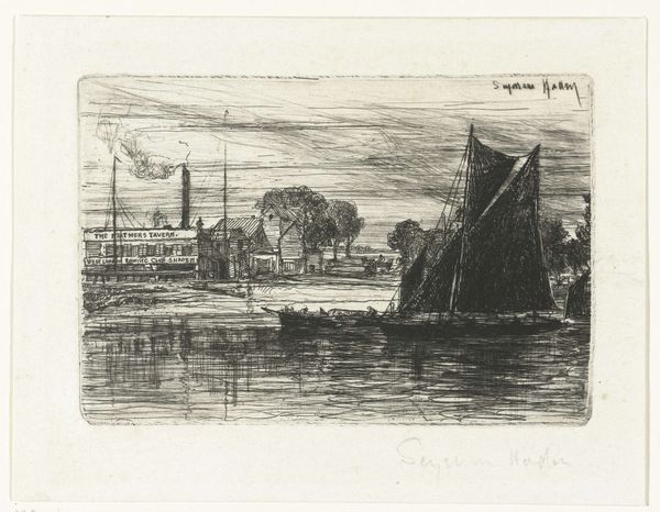 Editor: So, this is "Shipbuilding Yards," an etching by James McBey from 1904. It feels… nostalgic, almost hazy. There's this soft light over everything despite all the industrial activity suggested by the smokestacks. What do you make of this particular work? Curator: Oh, it's all about the dance, isn't it? The push and pull. McBey gives us industry—those belching smokestacks like dragons puffing away—but filters it through a lens of romanticism. See how the lines are so delicate, almost vibrating? It's like he's capturing a fleeting moment, a memory of a world being built. Does the work evoke anything for you, a particular feeling? Editor: It makes me think about the past and the future existing in the same space. Like, we see the boats of the time, and these shipyards represent progress but in such a gritty way. There's this melancholy tied to that progress. Curator: Precisely! That's McBey's genius. He understood that progress always casts a shadow. And notice the composition – how he leads your eye from the figures in the foreground, right through the heart of the shipyards and into the smoky sky. He isn’t simply documenting; he’s constructing a narrative. It's an elegiac poem of industry. Editor: That makes total sense. The hazy sky also mirrors the industrial haze rising in the distance. It is indeed poetic. It definitely has more depth than I initially gave it credit for. I never thought of cityscapes as places of memory. Curator: They’re often more revealing about our collective dreams and anxieties than portraits of royalty, you know? Think of them as emotional maps, where progress is inked with both hope and a hint of regret. We leave pieces of ourselves in them, like echoes.