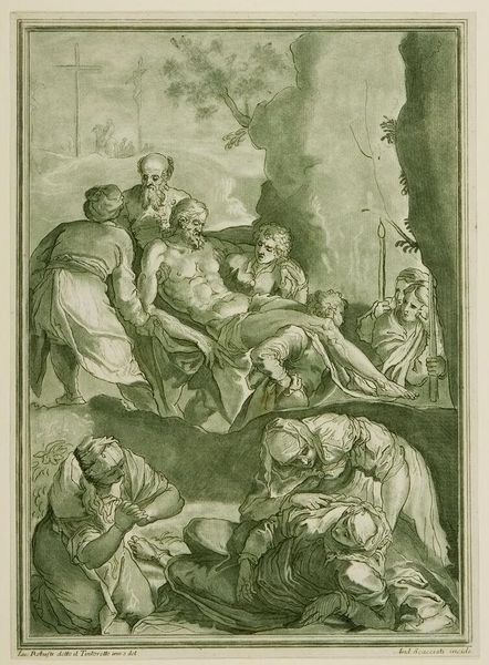 Curator: Duflos' "Entombment" presents a fascinating intersection of artistic production and social context. What strikes you most about this print? Editor: It's an engraving, so the lines are very clean, very precise, and it makes me think about the labor involved in creating something like this. What was the process like for Duflos to create this? Curator: Exactly! Consider the engraver's role – a craftsman translating another artist’s vision into a reproducible format. This piece was intended for dissemination, making religious narratives accessible. How does that context shift your perspective? Editor: I see it differently now. It's not just art; it's a form of mass communication, even back then. Thank you! Curator: Indeed. By understanding the materials and the means of production, we gain a richer understanding of its place in society.