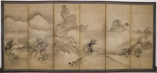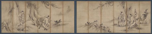 Editor: This is Volume 2 of Hokusai's *One Hundred Views of Mount Fuji*. The album format juxtaposes two scenes, each featuring the iconic mountain. I'm struck by the contrast between the tranquil mountain and the dynamic, almost chaotic waves. What formal elements stand out to you in this piece? Curator: The composition employs strong diagonal lines in both panels, creating a sense of movement. Note the repetition of forms – the cresting waves mirror the shape of Mount Fuji itself, flattening the composition. Observe how the monochrome palette emphasizes the textural contrast. Editor: So, it's less about a realistic portrayal and more about the interplay of shapes and textures? Curator: Precisely. Hokusai uses the image of the mountain more as a structural element, a visual constant, while he explores different arrangements and forms. What do you make of the human figures? Editor: They seem dwarfed by the landscape, further emphasizing the power of nature. Thanks, I see the piece very differently now. Curator: Indeed, a careful observation of form and composition reveals the artist's intent.