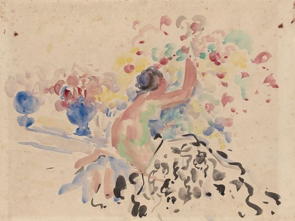 Curator: This watercolor piece, dating from between 1919 and 1924, is Edvard Munch's "Female Nude". Editor: It's incredibly raw, almost unfinished. The washes of red and blue create an ambiguous form; the woman almost dissolves into the background. Curator: Indeed. The painting reflects a post-World War I environment, showcasing a departure from conventional representations. We have to acknowledge Munch's struggle with mental health, adding a complex dimension to understanding his perspective. Editor: You know, the red around her form reminds me of devotional art where red often represents divine love and sacrifice. Is it possible Munch was attempting to grapple with notions of femininity through established visual language? Curator: A nuanced point, especially given the patriarchal structures Munch inhabited. One could see it as a reclaiming of agency, situating the female nude not as a passive object, but as a locus of intense feeling. The almost violent brushstrokes mirror a broader societal disruption and perhaps the expression of internalized conflict? Editor: Yes! And beyond that, the use of blue is striking. Notice the broad strokes around her form – they evoke the Virgin’s traditional cloak, almost as if to soften the expressionistic pain. Do you think Munch was attempting to subvert his feelings toward woman by linking the nude to established symbolic expression? Curator: That's an astute reading. The juxtaposition suggests not a stable symbolic language but rather an intentional breaking down. The cultural symbols may be deployed, but are rendered uncertain within Munch’s artistic and social context. Editor: It offers such insight into his artistic project! These images create cultural memory over time. Curator: Ultimately, the emotional vulnerability layered into this piece offers endless areas for exploration through gendered social history.