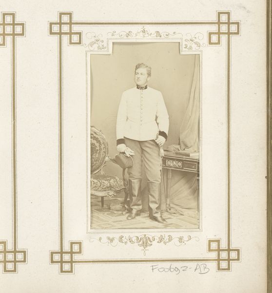 Editor: This is an intriguing photograph from the Rijksmuseum collection: an anonymous gelatin-silver print, dated circa 1860-1865, titled "Portrait of the Prussian General Von Nostitz." The general's formal pose and stern expression create quite a serious mood. What do you see in this piece? Curator: I see more than just a stern portrait. I see a carefully constructed representation of power at a pivotal moment in Prussian, and indeed European, history. Consider the context: the 1860s were a period of immense social and political upheaval. How does this photographic portrayal of General Von Nostitz reinforce or perhaps challenge prevailing notions of masculinity and authority during that time? Editor: Well, the uniform is definitely a symbol of authority, right? The way he holds the sword seems intentional too. Curator: Precisely. But it's not just about displaying power; it's about projecting a specific *kind* of power. The Realist aesthetic of the photograph itself—the almost clinical detail—lends a sense of undeniable truth and authenticity. This contrasts sharply with earlier, idealized Romantic portraits. Does this shift in visual representation suggest a changing relationship between the military, the state, and the people? Think about the rise of nationalism. How do images like this contribute to its construction and dissemination? Editor: That's fascinating. So it's not just a picture of a general, it’s part of a bigger historical conversation. Curator: Exactly. The portrait participates in, and helps to shape, broader narratives of nationhood, militarism, and social order. It encourages us to question whose stories are being told, and how. What isn't revealed in this carefully managed portrait is perhaps just as telling as what is. Editor: I've learned so much! I'll never look at another portrait the same way. Curator: Indeed. Art opens up unique ways of understanding power dynamics throughout time.