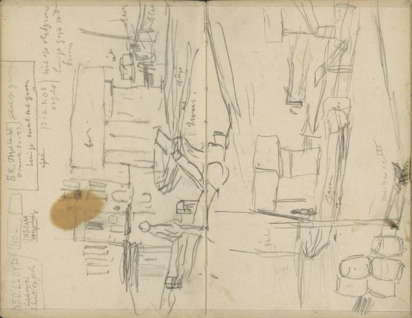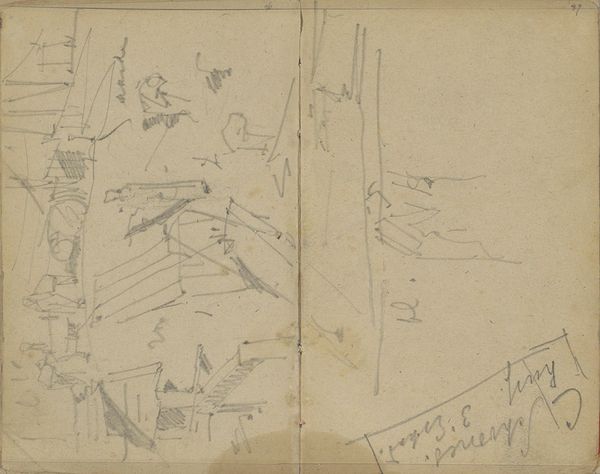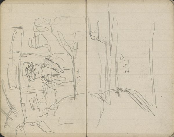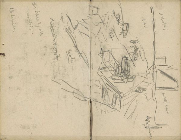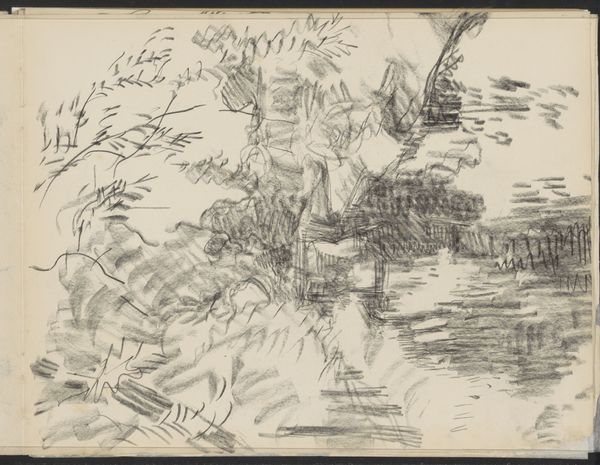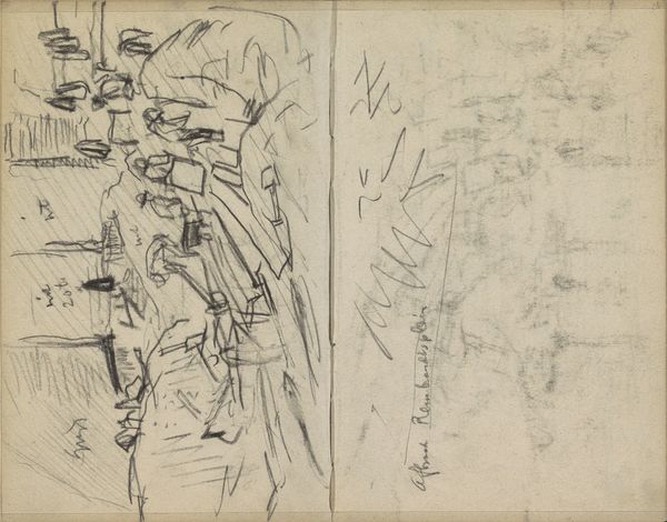 Curator: Here we have a pencil drawing by George Hendrik Breitner, likely created between 1887 and 1891. It’s entitled, "Two Seated Figures and a Landscape." What strikes you first about this work? Editor: Its incompleteness. The eye darts, searching for clarity but only finding suggestions of form. It feels like a fleeting thought captured on paper. Curator: Absolutely. Look at how the seated figures are rendered – just a few lines, some shading, hinting at posture and weight but never fully resolving into defined individuals. This imprecision reflects Impressionistic principles that permeated much of Breitner's work, as is revealed by the visible landscape nearby. Editor: Indeed. The landscape seems equally ephemeral – a quick notation of light and shadow defining some natural setting. I’m intrigued by the stark contrast of forms. Curator: There's a tension between capturing a scene's raw energy and leaving room for the viewer's interpretation. I notice the interplay of dark and light. How might this evoke feelings of both presence and transience? Editor: Breitner here isn’t presenting a finished product, but rather inviting us into the creative process, an interesting move away from artistic self-assuredness. Curator: Yes! I feel that it allows us to project our own narratives, imbuing these shadowy figures with stories and meanings of our making. Does this tell us anything about late 19th-century audiences perhaps getting more self-aware and starting to enjoy the spectacle of spectatorship itself? Editor: That is something to reflect on! Ultimately, for me, this sketch invites speculation. Are these people lost in contemplation, or merely resting before moving on? The image becomes a portal, leading back to our personal lives and lived memories. Curator: Indeed, Breitner's drawing allows a certain continuity that can be adapted across changing generations. There is a connection forged across time, where the act of creating blends with our own experiences, and even our aspirations, thereby altering history as such!