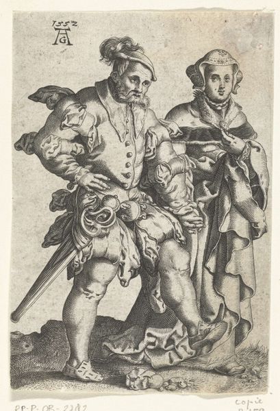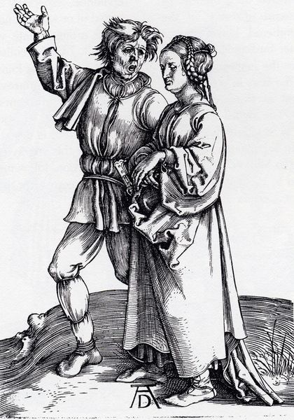 Editor: Standing before us is Albrecht Dürer's "Rustic Couple," a woodcut and engraving completed between 1495 and 1498. The textures achieved through line work give this piece a tangible rawness. What formal elements strike you most about this work? Curator: Certainly, the tension between the chaotic energy of the man's gesture and dishevelled hair and the woman's stoic and contained posture is key. Note how Dürer uses contrasting densities of line to sculpt their forms and to suggest light falling unevenly across their garments. Does this contrast influence your interpretation? Editor: It really does! It makes me wonder about their relationship. The man looks so agitated, while the woman seems indifferent, even constrained by the tight braiding. How does Dürer create such drama solely through line and composition? Curator: Observe how the converging lines in the background ground plane propel our gaze upwards towards the figures. The man's expansive, upward reaching gesture is mirrored by the rising lines, while the woman's vertical stance and downward gaze create a counter-current. Also, consider the economy of the medium. Every mark is deliberate, contributing to both representation and expressive impact. Editor: It's incredible to see how much Dürer achieves with such limited means. It makes me consider the graphic quality and symbolism within the work. Thanks for highlighting those visual tensions, it has significantly changed how I viewed it. Curator: Indeed, understanding how form communicates and reinforces themes illuminates Dürer's artistic prowess.