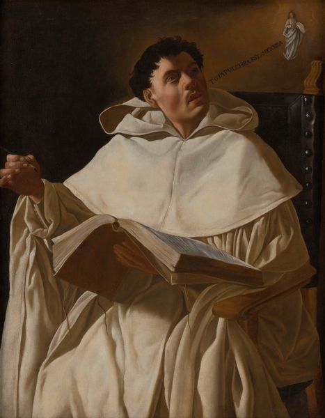 Editor: Here we have Joshua Reynolds's portrait of Samuel Johnson. The play of light and shadow gives it such a contemplative feel. What can you tell me about the symbolism? Curator: Notice how Johnson isn't surrounded by elaborate finery, but rather books and a scroll. These aren’t just objects, they're symbols of intellect, of the written word's enduring power, and a nod to Johnson’s own literary legacy. What feelings does that evoke in you? Editor: It really underscores his importance as a writer and thinker. I hadn't considered how deliberately those symbols were chosen. Curator: Exactly! Reynolds uses these familiar images to subtly elevate Johnson, associating him with timeless ideals of knowledge and wisdom. Editor: That's fascinating; I’ll never look at portraits the same way again! Curator: Indeed, symbols whisper stories across centuries.