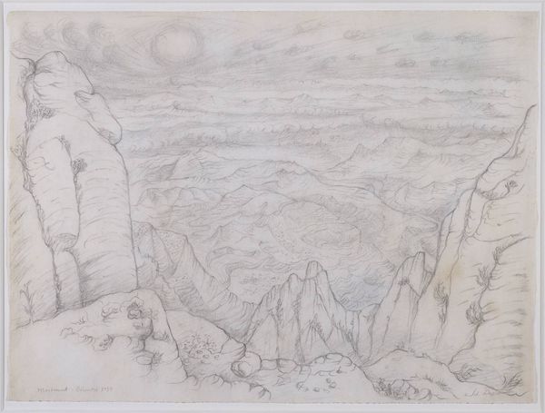 Curator: Immediately, this evokes a kind of dreamy, monumental quality. It’s all in grayscale, a bit faded, and gives the impression of towering forms rendered almost ethereally. Editor: What you are responding to there is quite central to this pencil drawing called "Bergen bij Ragatz," or "Mountains near Ragatz," created by Isaac Gosschalk between 1860 and 1861. It is quite fascinating how Gosschalk captured such grandeur with such simple means, a pencil, graphite, and drawing techniques, don't you think? Curator: Absolutely! And, knowing the period, you see those Romantic inclinations to convey nature's sublime force, the way tiny little trees seem to bow beneath the silent stone giants. It is almost humbling! Is there a hint of premonition or foreboding? It has me asking questions I am not sure of the answers to! Editor: That sense of premonition resonates if we think of mountains in the symbolic language. Throughout cultures, mountains often stand for permanence, obstacles, and spiritual ascension all at once. Gosschalk lived during a period of considerable social and scientific upheaval; perhaps he found in the mountains an enduring symbol against ephemeral change. Or a personal connection with this mountain range… Curator: Or even a bit of both, why not? Maybe the artist was simply capturing a view and imbuing it with his whole world. It's just lines, shapes, and tones playing hide-and-seek on paper, and that's where its haunting resonance lives! Editor: Well said, his approach beautifully reminds us how elemental forces, inner states, and artistic expressions become beautifully intertwined when seen with the inner eye. Thank you. Curator: Thank you too; I'll never look at pencil sketches the same again!